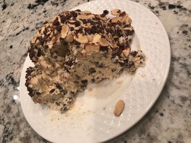 It’s like a cheesecake wrapped in a hug of chocolate chips and sliced toasted almonds.